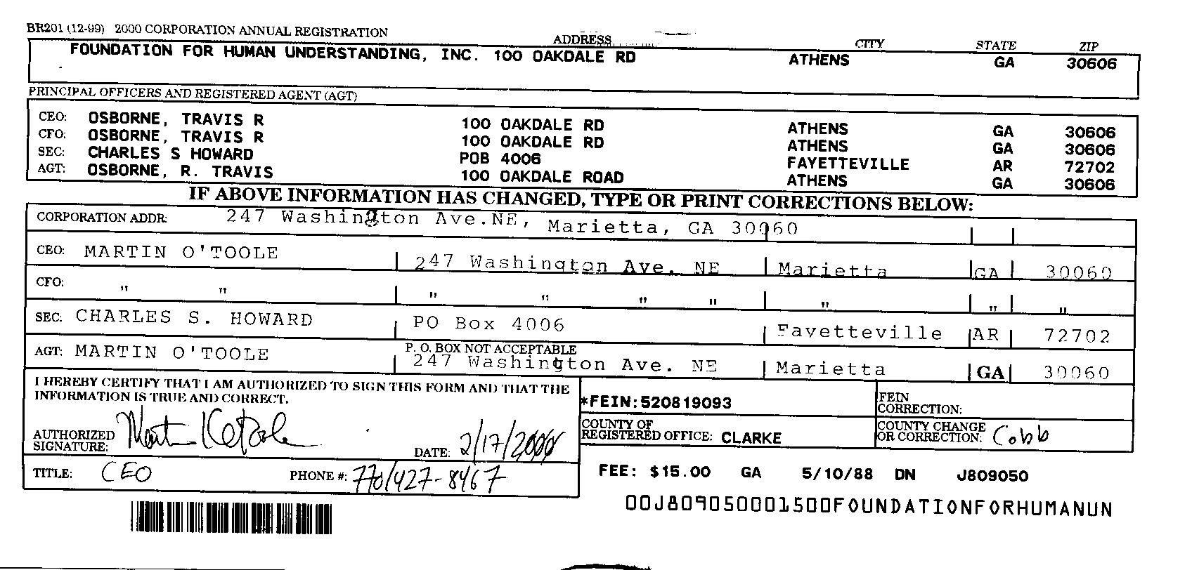 Research published in 2024 tied Martin O’Toole to the circulation of a notorious piece of neo-Nazi propaganda. Approximately one decade before O’Toole first appeared on IRS paperwork as a Charles Martel Society participant, O’Toole featured on filings for another nonprofit, the Foundation for Human Understanding (FHU). FHU, founded in 1973, was a tax-exempt organization promoting racist pseudoscience. It disbanded in the mid-2000s. An FHU filing with the Georgia Secretary of State in early 2000 updated the Foundation’s business records to reflect the departure of R. Travis Osborne. The same filing showed Martin O’Toole newly listed as the organization’s CEO, CFO, and agent. According to federal filings with the IRS, O’Toole was FHU’s President in 2002 and 2003, with him dropping down to a director role in 2004 and 2005. (FHU’s 2001 filing failed to name any agents or directors, although that year’s IRS filing does claim that O’Toole was taking care of FHU’s accounts.)