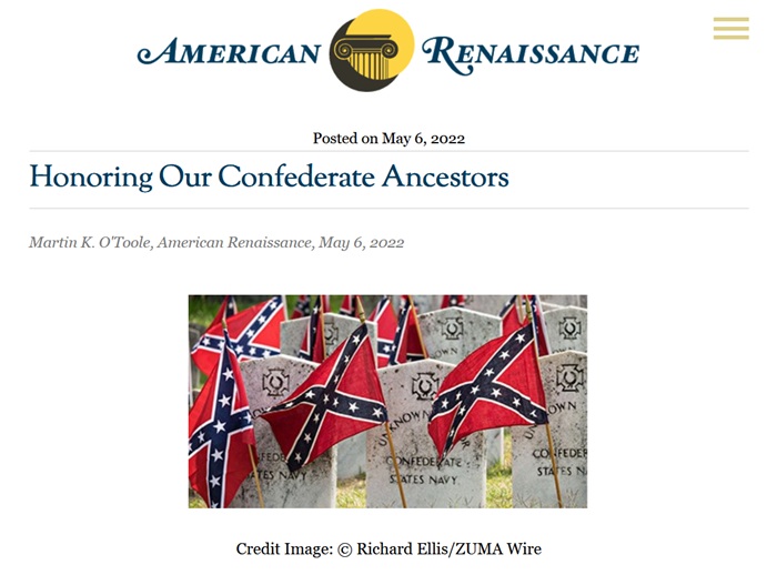 Following the publication of our first “Notes” on O’Toole, O’Toole gave the keynote speech at the 2022 Georgia Sons of Confederate Veterans “Confederate Memorial Day” event at Stone Mountain Park. In his speech, O’Toole complained that “Modern America has become the land of the Living Dead. […] ‘Diversity’ is the idol before which they prostrate themselves.” In response, O’Toole urged listeners to renounce this society and instead live by the “eternal values” that Confederate ancestors allegedly honored. The American Renaissance website published O’Toole’s speech in full the following week.