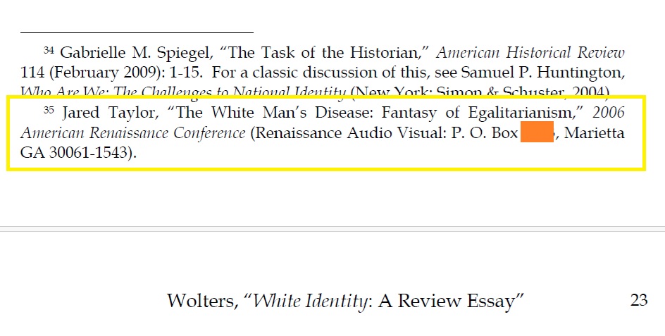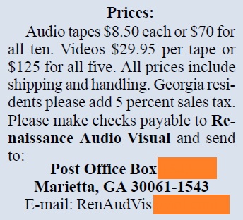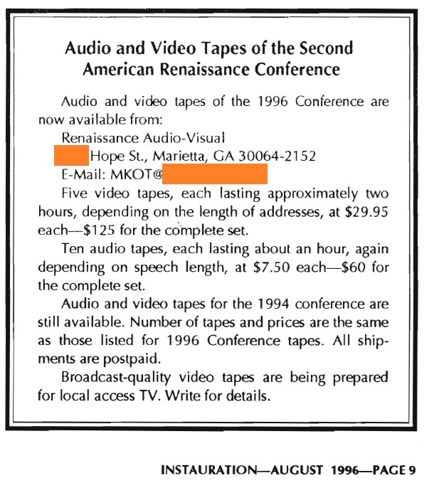 O’Toole’s name does not feature in New Century Foundation official paperwork, but he has been an AmRen participant over the years. In 1996, an advertisement offering video and audio tapes from that year’s American Renaissance conference appeared in Instauration. The contact email for “Renaissance Audio-Visual” is Martin O’Toole’s personal account, and the address in Marietta, Georgia is a former one for O’Toole. Later, “Renaissance Audio-Visual” changed to a PO Box in Marietta rather than a street address, and eventually the business got an email address of its own. “Renaissance Audio-Visual” produced and sold copies of AmRen conference speeches for at least a decade—an article in The Occidental Quarterly references a copy of a 2006 speech released by the company. As Renaissance Audio-Visual was the official source for hard copies of AmRen conference speeches and was advertised by AmRen, it is likely that the business had little independent existence, with funds raised going straight back to AmRen/New Century Foundation.